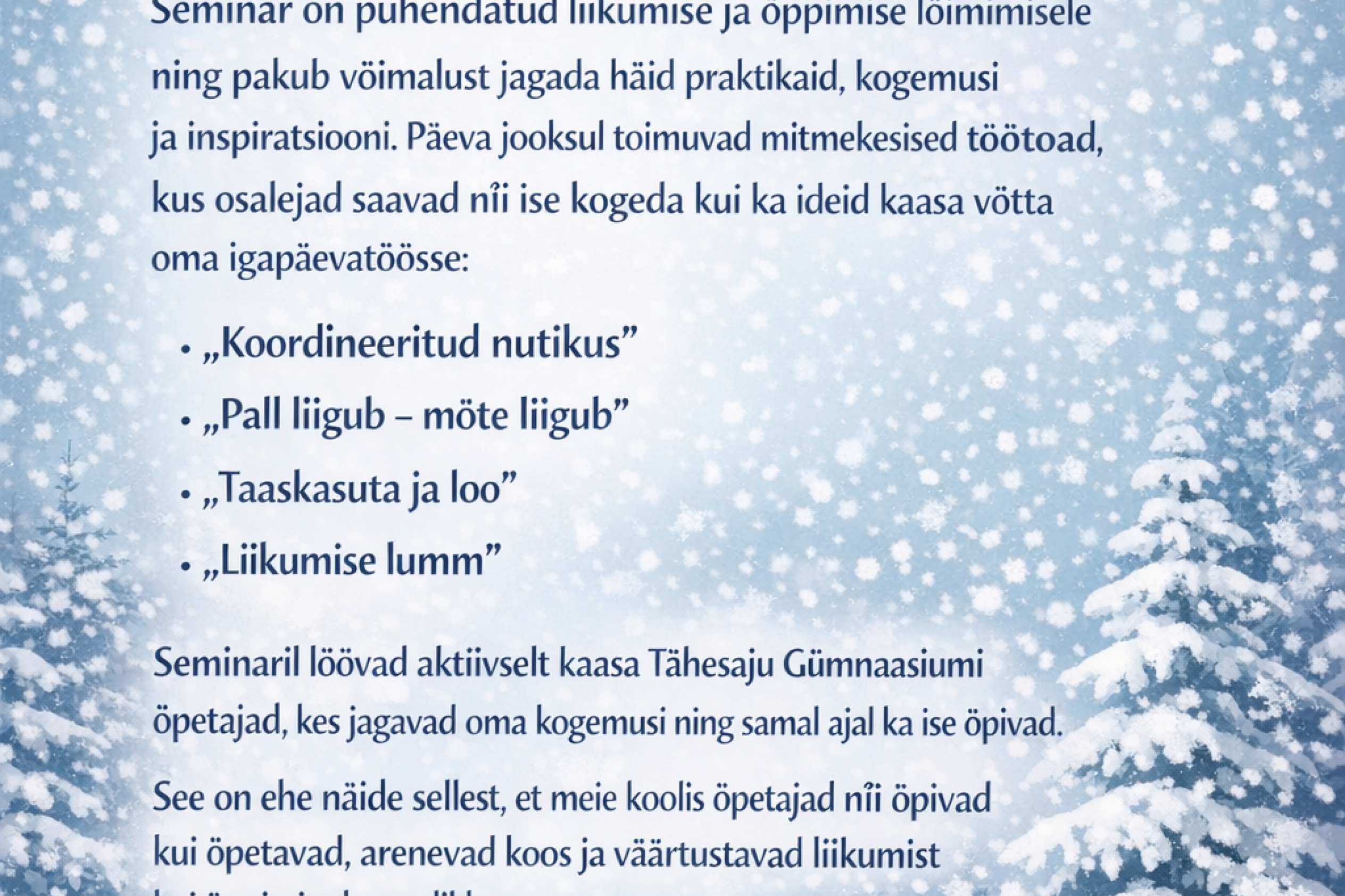 Seminar keskendub liikumise ja õppimise lõimimisele ning pakub võimalust jagada häid praktikaid, kogemusi ja inspiratsiooni. Päeva jooksul toimuvad mitmekesised töötoad, kus osalejad saavad nii ise kogeda kui ka ideid kaasa võtta oma igapäevatöösse.
